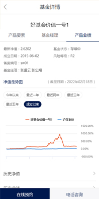 產(chǎn)品展示:向合格投資者展示產(chǎn)品業(yè)績(jī),如產(chǎn)品凈值、年度業(yè)績(jī)、回撤、風(fēng)險(xiǎn)評(píng)測(cè)等全方面的產(chǎn)品業(yè)績(jī)