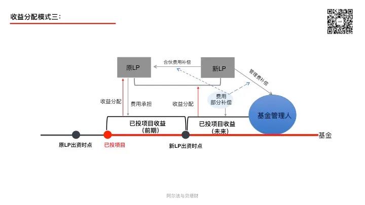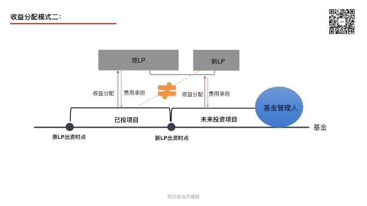 此種收益分配模式下,新LP無需支付原LP資金占用費(fèi)、也無需補(bǔ)交基金前幾年的管理費(fèi)。實(shí)踐中采用此種模式的相對第一種模式較少。